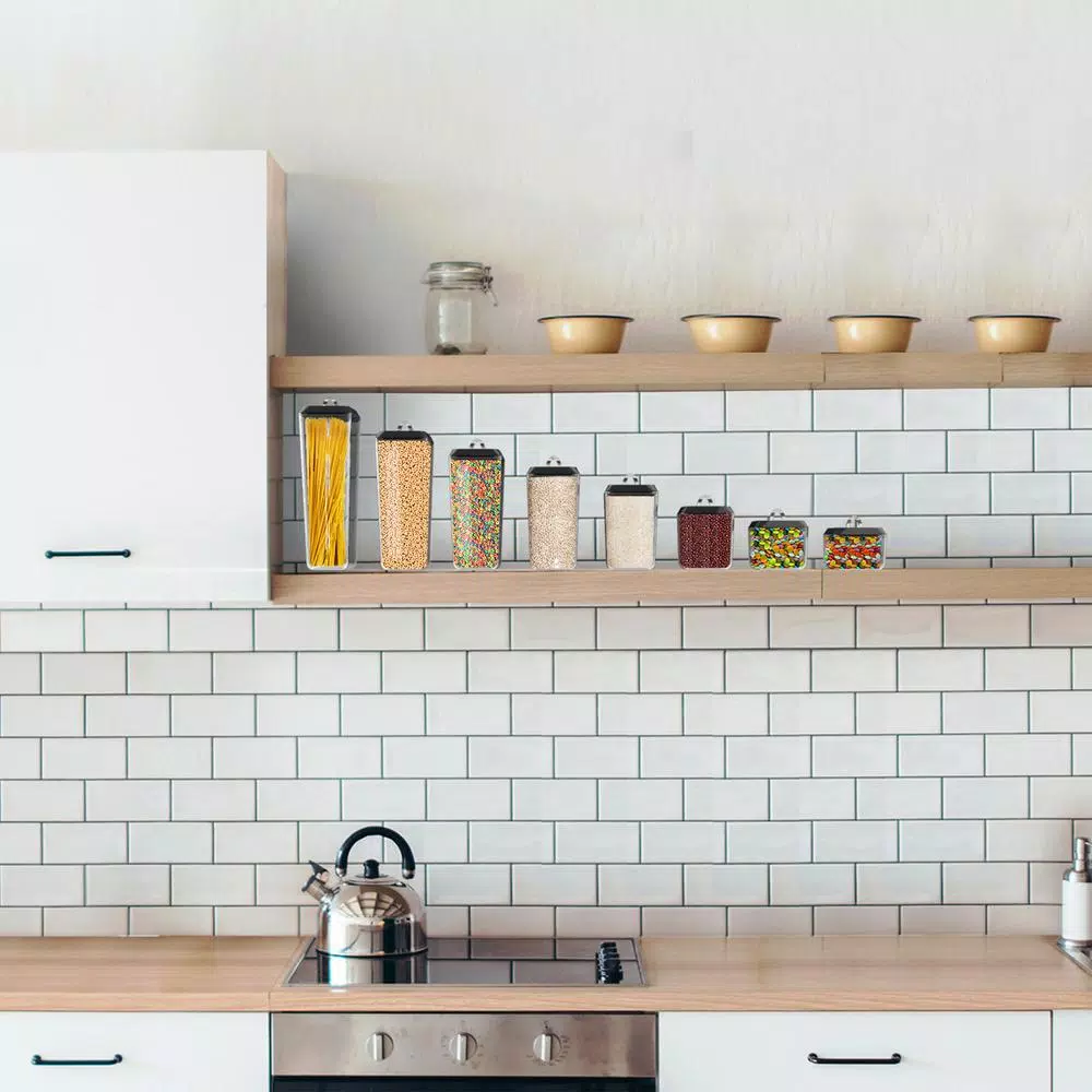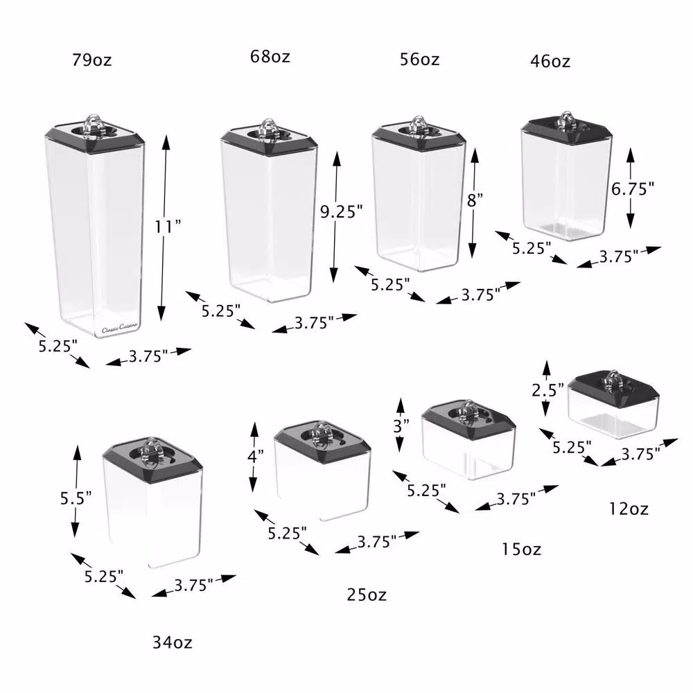 - 8-piece set includes: one 79 oz., one 60 oz., one 56 oz., one 46 oz., one 34 oz., one 25 oz., one 15 oz., and one 12 oz. canister