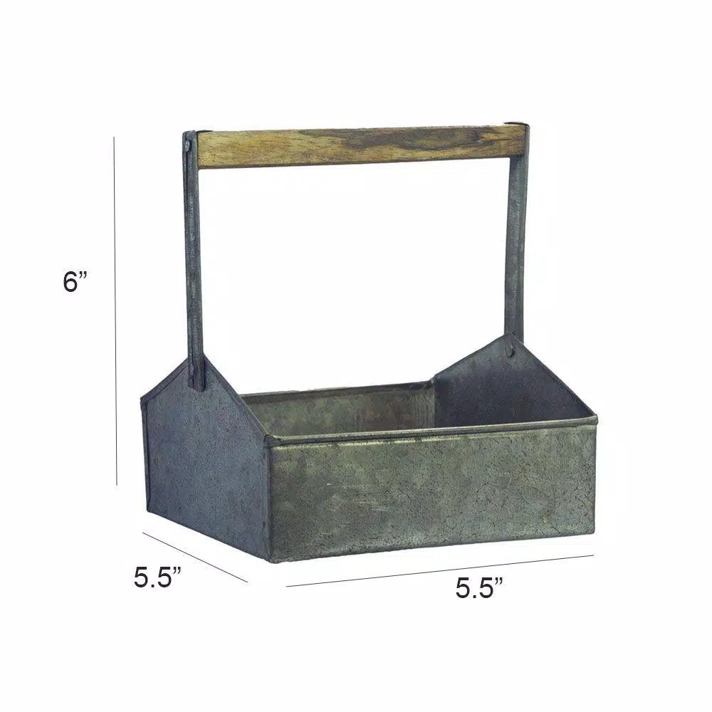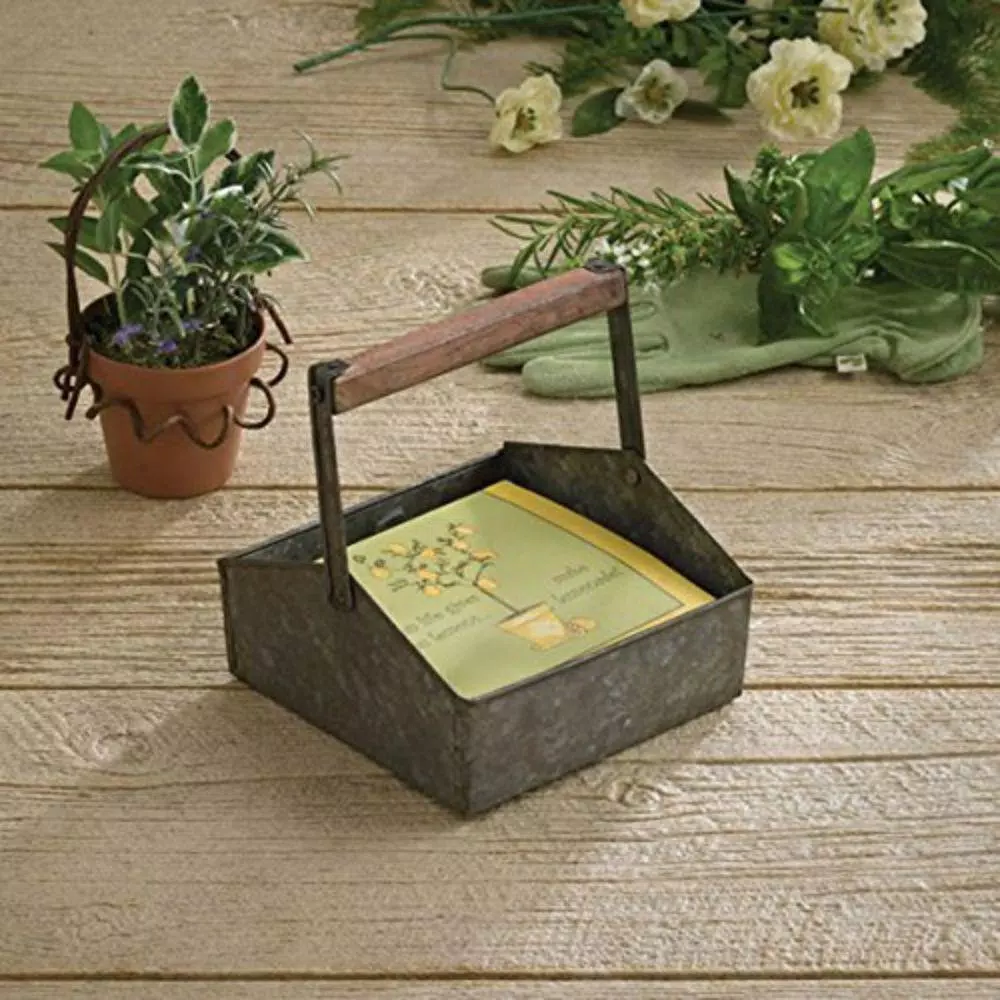 Display your napkins and other items in style with this farmhouse style galvanized metal napkin caddy. It is versatile in design and features an aged distressed gray finish and fitted wooden handle that provides good grip and easy transporting. This caddy is sure to add a touch of rustic elegance to any table setting or counter top. As it is made up of galvanized steel, it has rust free quality that makes it accessible, even in outdoors.
