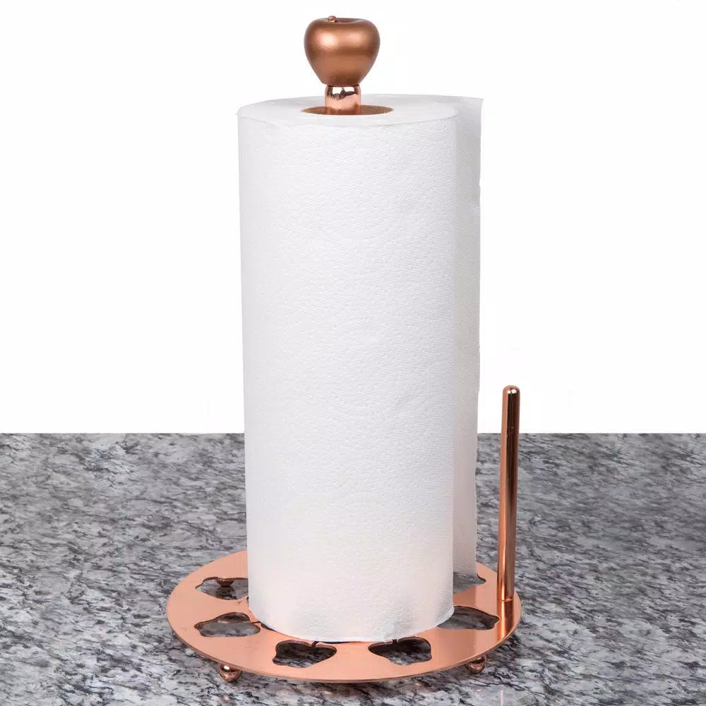 Features an apple design laser cut motif into the base surface. Dimensions: Dia 7-7/8 in. x 13-1/2 in. H. Elegant copper finish. Fits in jumbo paper towel roll. Hand wash recommended.