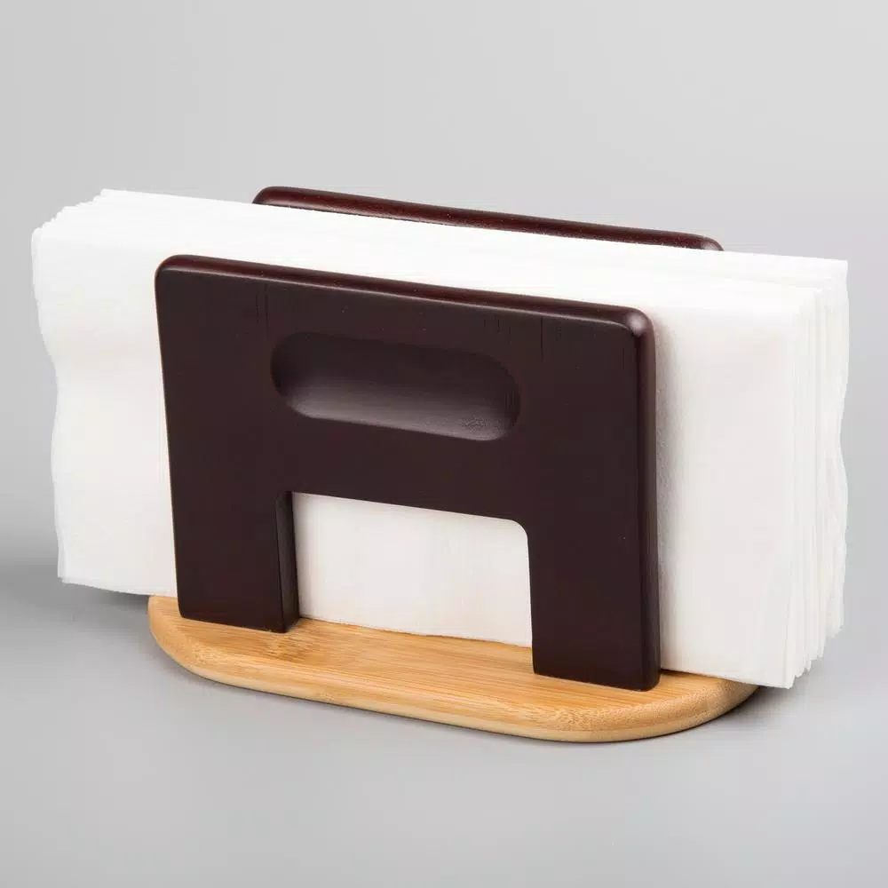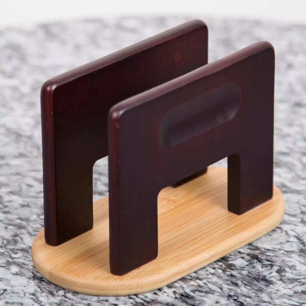 Combining the convenience of a restaurant-ready upright napkin holder with the kind of simple, sophisticated styling that works with everything from antique mahogany to streamlined Scandinavian dining chairs, this bamboo napkin holder gives your table both a useful new receptacle and a piece of decor that will look great next to almost any place setting. The espresso stain on the two top pieces adds a splash of sophisticated contrast to any collection of light-colored cloth or paper napkins. Upright napkin holder made with natural bamboo. Water friendly. Wash it with mild soap. Rinse and dry thoroughly.