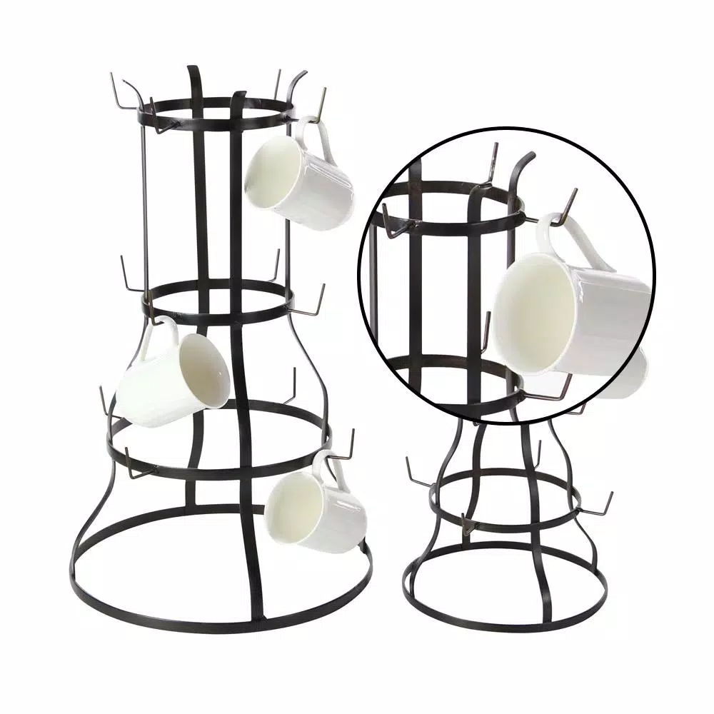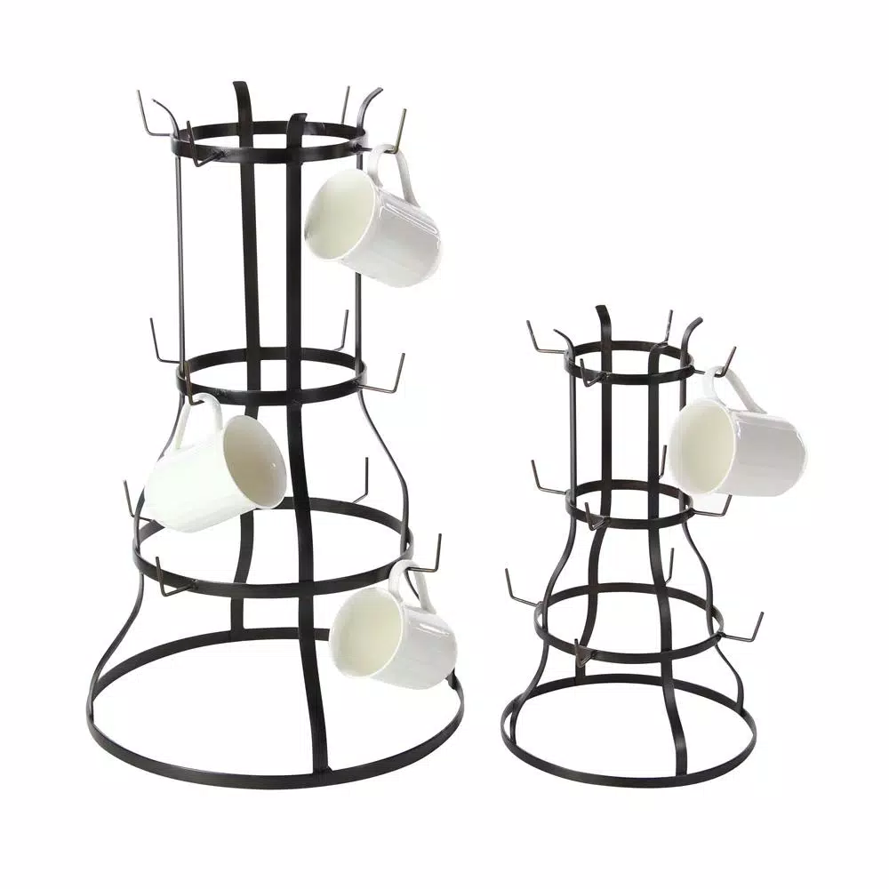 This set of 2 mug racks features bell-shaped metal stands with ring brackets and hooks that provide convenient storage options. The black iron finish of these mug racks gives it an elegant, modern look. The rugged appearance of these mug racks adds a distinct, rustic vibe to contemporary themed settings.