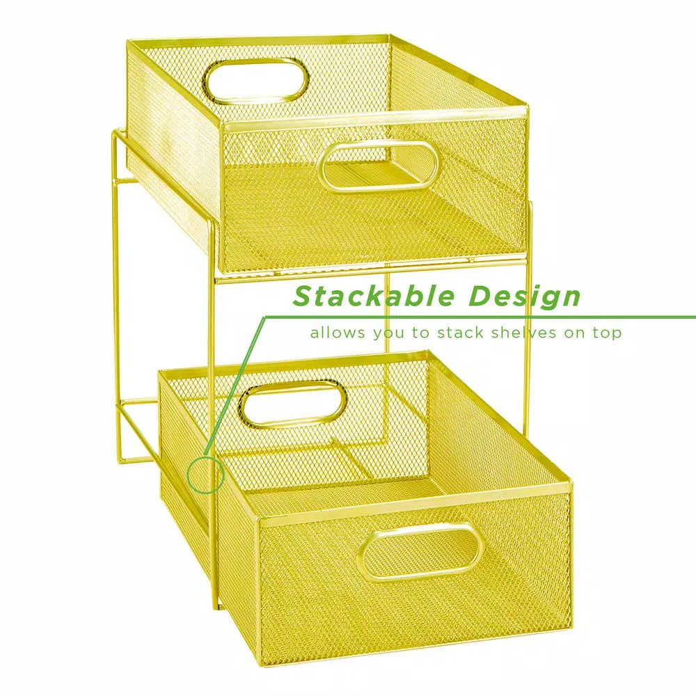 The MIND READER Metal Mesh Organizer is your space-saving vertical storage solution for every room in your home. Easily find what youโre looking for inside either of the spacious wire baskets that can also slide out or be removed. Your items or supplies will always be right where you left them, for whenever youโre reaching under your kitchen or bathroom sink, inside your panty, or across a cabinet or shelf in your office. Constructed from solid steel, providing a strong frame, The MIND READER Metal Mesh Organizer is able to hold almost any of your household items that may be too large or cumbersome for traditional plastic storage options. The rubber grips underneath also give you added stability for the most challenging surfaces or environments at home. Youโll never worry about your items moving around or slipping off shelves or cabinets again. Weโve also built each basket with handles, allowing you to bring anything youโve stored with you around the house. And in case of spills or stains, the metal mesh design allows you to simply rinse it away or wipe down with a wet or dry cloth. If youโre looking for versatile two-tiered storage thatโs both discrete and sturdy, The MIND READER Metal Mesh Organizer is everything youโll need and more.