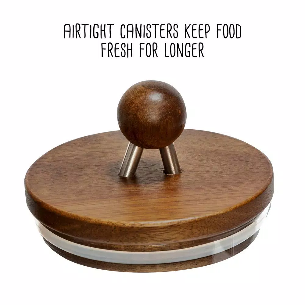 Keep your food fresh for longer with this 3-piece glass canister set that stores everything from nuts to granola to pasta to candy. Silicone rings and the acacia wood top keep the canister airtight and borosilicate glass is durable for everyday use. Varying in size, the canisters range from 22 oz. (small) to 34 oz. (medium) to 40 oz. (large).