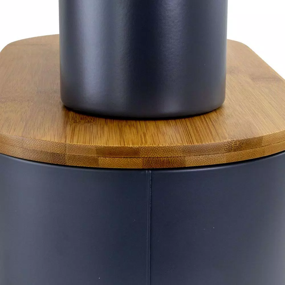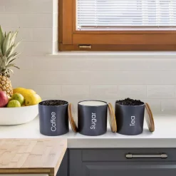 Preserve the freshness and quality of your food with the MegaChef 4-Piece Metal Bread Basket and Canister Set in Gray with Bamboo Lids. Featuring a bamboo lid that includes an air tight rubber ring, ensuring your food will be kept fresh for weeks to come. Each canister is crafted of metal with a white finish throughout and can hold up to 2.5-cups of your favorite coffees, teas and sweeteners. Bread box is also ideal for keeping your fresh breads just as fresh as the day you put them in. Each container has a matte white finish and is labeled for your convenience. Bamboo lids on each storage jar is easy to care for, wipe clean when needed. The lid on the bread box also serves a multi-function, use it as a cutting board and a serving tray. This MegaChef Kitchen Storage and Organization 4-Piece Canister Set was conveniently designed with you in mind.
