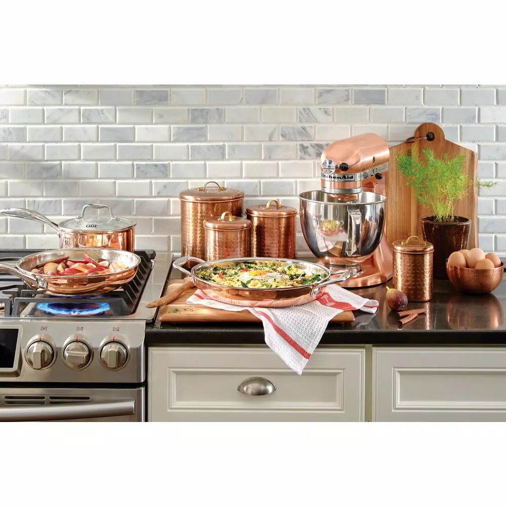 Decorate your kitchen with Old Dutchโs Hammered Antique Copper Canister Set. Each canister features Fresh Seal cover technology to keep your stored items fresh and safe. With their vintage hammered finish and generous capacity, these Copper Plated Stainless Steel canisters are an attractive and practical countertop storage solution.