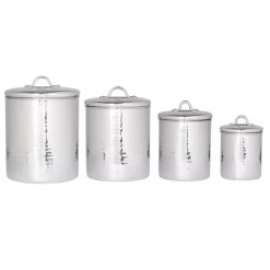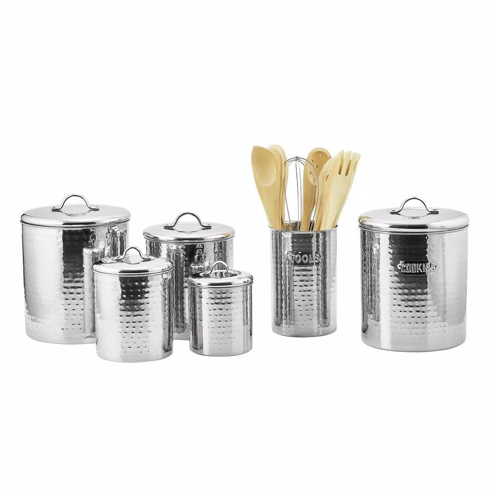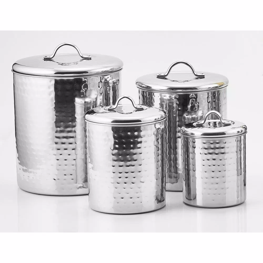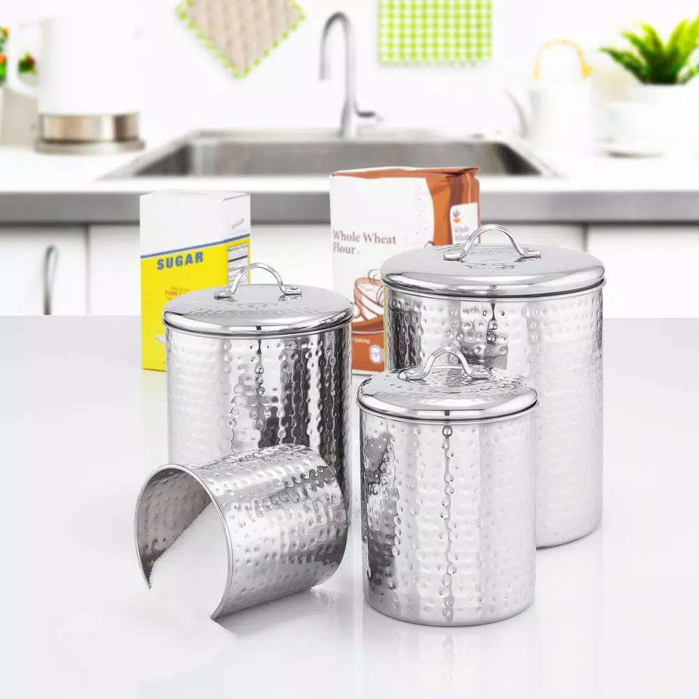 With their hammered finish and generous storage capacity, these stainless steel canisters are the perfect countertop storage solution. Fresh Seal cover technology keeps stored items fresh and safe. Tarnish-resistant. 1 Qt., 1.5 Qt., 2 Qt. and 4 Qt. capacities.
