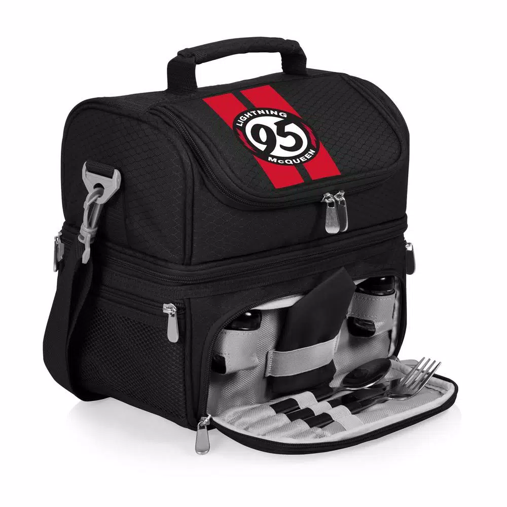 Level up your lunch box game with the Pranzo Personal Cooler, an insulated picnic/lunch cooler for 1 with top and bottom compartments to separate cold foods from warm/room temperature items. This polyester 8-can-capacity picnic bag with an adjustable shoulder strap and grab-and-go handle also has a secret compartment containing stainless steel silverware, frosted glass salt and pepper shakers, and a red 100% cotton napkin. Zippered mesh pockets on each side provide the perfect space for keys, wallets, or UNO cards.