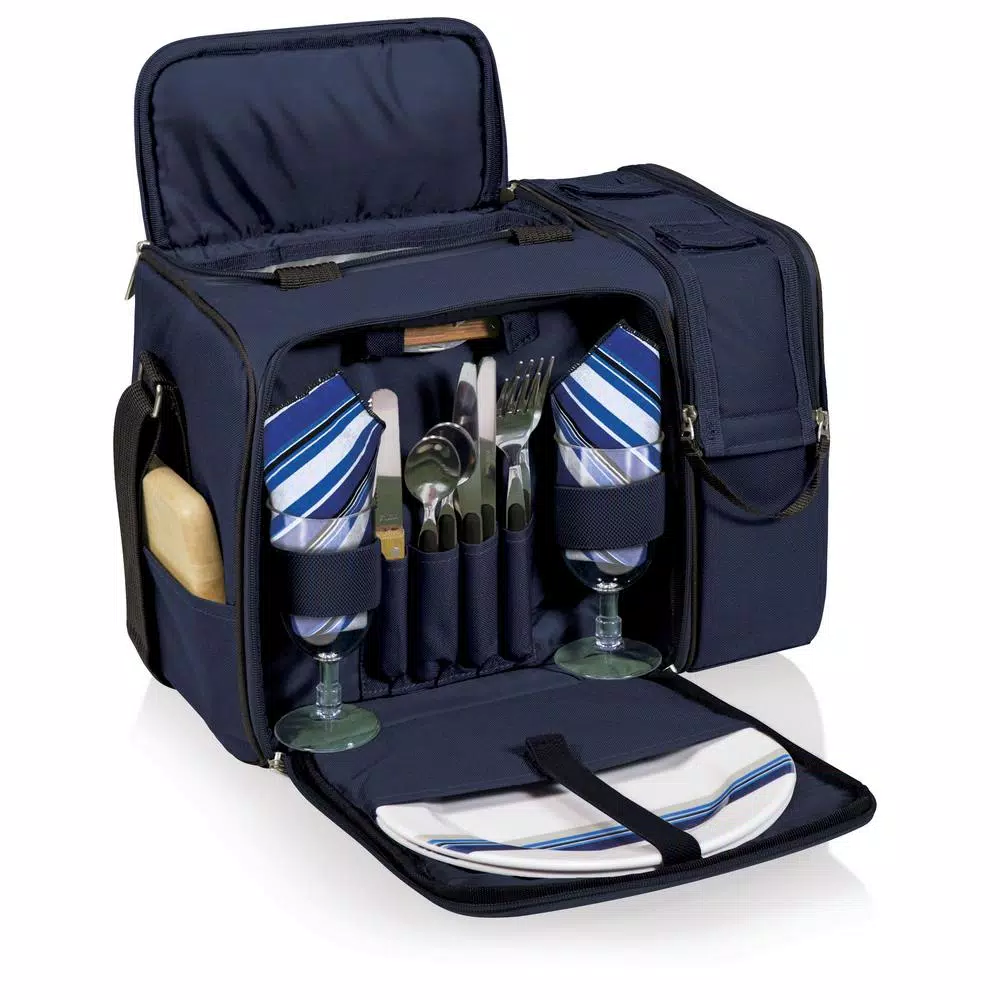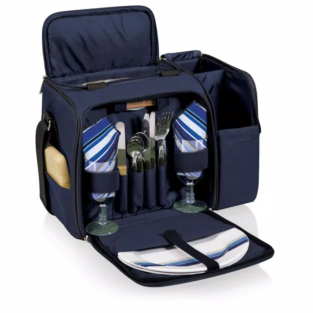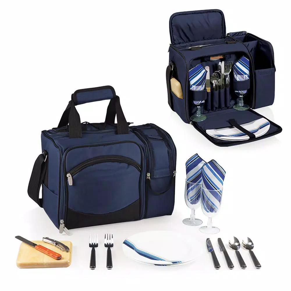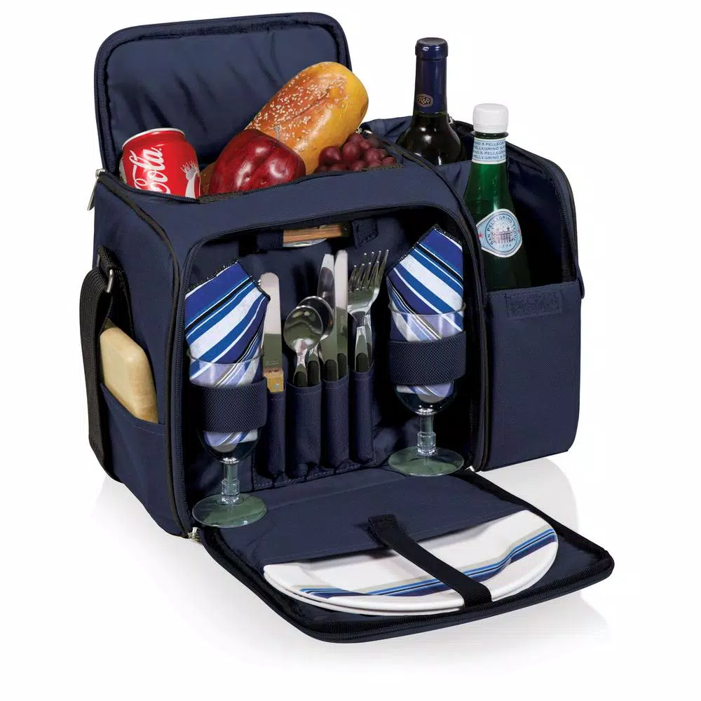 The Malibu is the most convenient go-anywhere picnic pack you can find. Fully insulated, itโs made of 600D polyester and comes with deluxe picnic service for two. The Malibu features an insulated and divided wine section for two bottles and a removable water-resistant liner in the food storage area. Its amenities include: 2 plates (melamine, 9โณ), 2 wine glasses (acrylic, 8 oz.), 4 napkins (100% cotton, 14โณ x 14โณ), 2 (18/0) stainless steel forks, knives, and spoons, 1 hardwood cutting board (6โณ x 6โณ), 1 stainless steel cheese knife with wooden handle, and 1 stainless steel waiter-style corkscrew. The Malibu is great for the beach, concerts, and casual picnics.