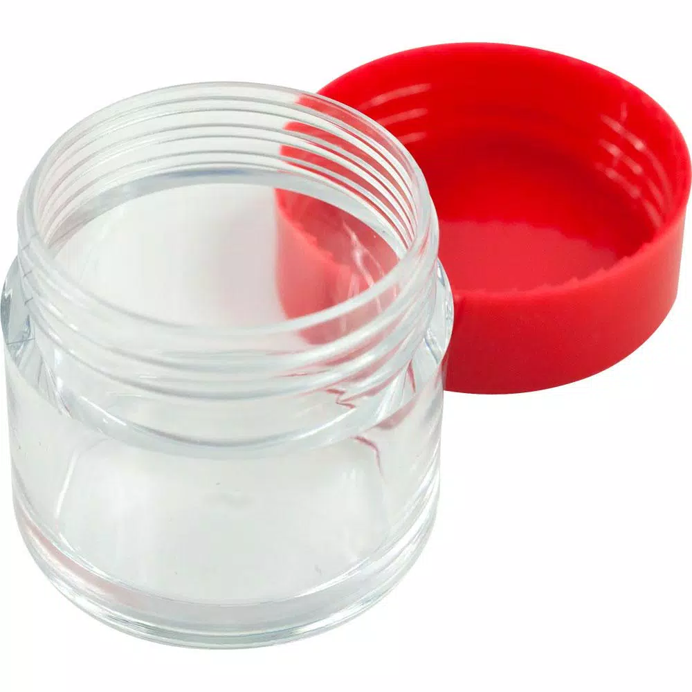 The 12-Piece 20 ml Clear Plastic Storage Jars with Colored Lids by Stalwart will get you organized. These 20 ml plastic jars are great for holding a variety of items for easy organization according to their red, green, purple and black lids (three of each color). From craft supplies to small hardware and more, this set of twelve 20 ml Color Coded Plastic Jars can be used for hobbies and small parts storage and organization.