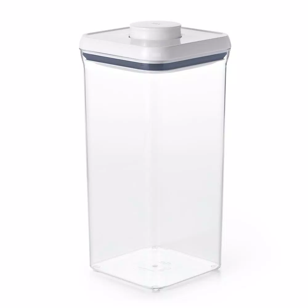 Stackable and space-efficient, POP Containers are designed for modular use, so you can organize in any number of height combinations to fit your countertop and pantry. Push-button mechanism creates an airtight seal with just one touch. Corners are shaped for pouring. Lids come apart for cleaning.