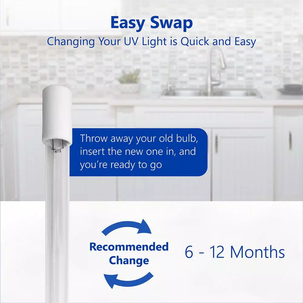 Start drinking healthy and stop drinking contaminants with your own home Ultraviolet UV system. The UV light is good for 6 months to 1 year of use and features a monitoring system to alert you when the power of the UV bulb falls below range. A red light on the ballast will activate once the bulb needs to be replaced and will sound a beep. The life is based on average water quality. Your UV light purifier life may be different depending on your water quality, temperature, and incoming pressure. This durable Ultraviolet bulb can deliver up to 1 gallon per minute. The system works with 45-80 psi and water temperatures between 40-100°F. Made with 100% pure food-grade materials complete with high intensity UV water sterilizer bulb and reflective inner walls for maximum UV coverage. Never turn on your ultraviolet light outside of its housing. Do not look directly at or expose any part of your body to the UV water filter light. Choose the UV system and UV water purifier that lasts longer to give you the best value: The Express Water Ultraviolet Housing and Bulb FLTUV110BCH.