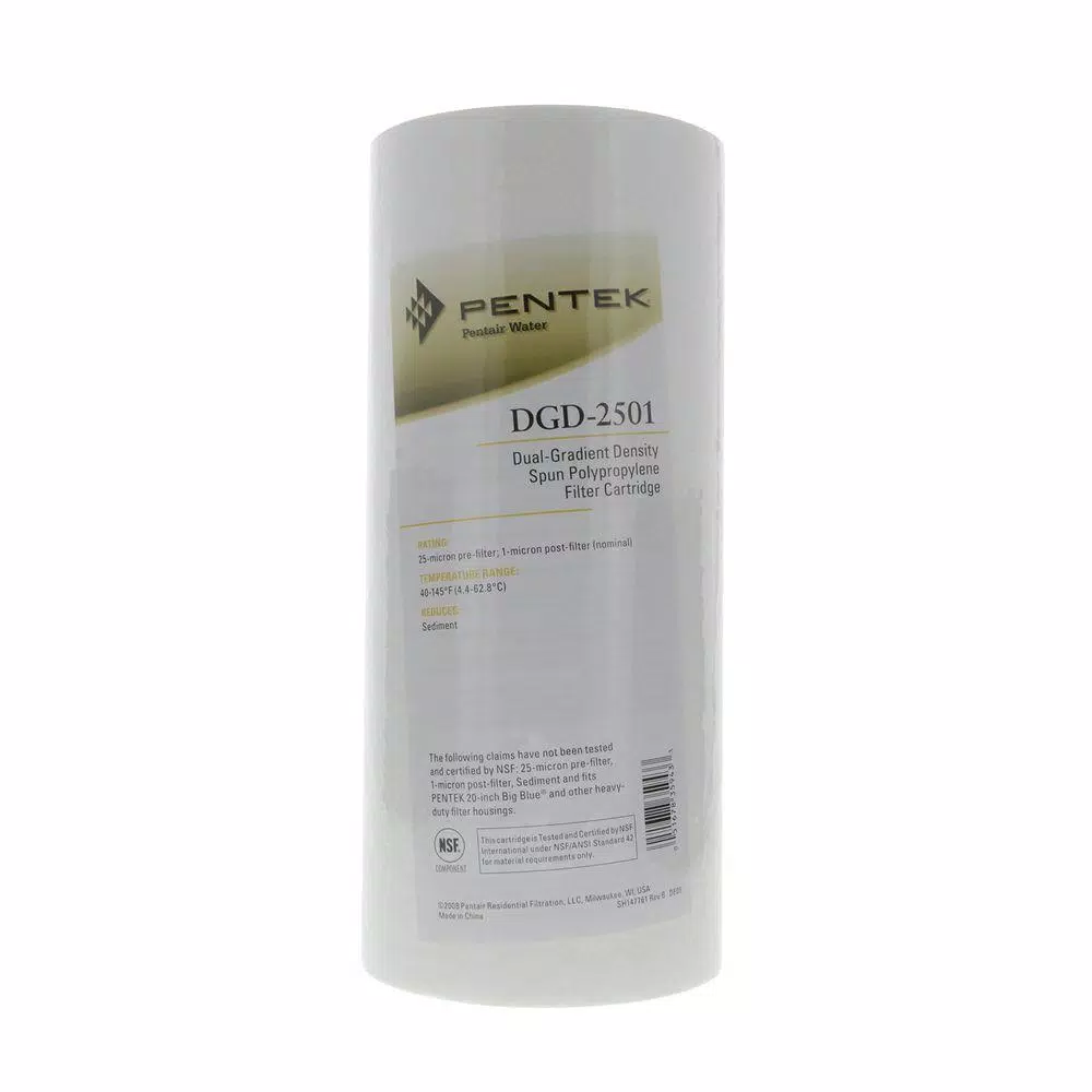 This Pentek DGD-2501 spun polypropylene filter cartridge reduces sand, silt, scale, and rust particles in residential, commercial, and municipal drinking water. It has 2 separate gradient layers for higher particle reduction efficiency and dirt-loading capacity than standard spun or string-wound cartridges. The nominal filtration rating of the pre-filter layer is 25 microns, and the rating of the post-filter layer is 1 micron. The filter is made of spun polypropylene fibers for resistance to chemicals and bacteria. It has an initial pressure drop of less than 1 psi at a flow rate of 10 GPM, and operates over a temperature range of 40 to 145°F (4.4 to 62.8°C). This spun polypropylene filter cartridge meets National Sanitation Foundation/American National Standards Institute (NSF/ANSI) standard 42 for quality assurance, and is used for treatment of residential, commercial, and municipal drinking water.