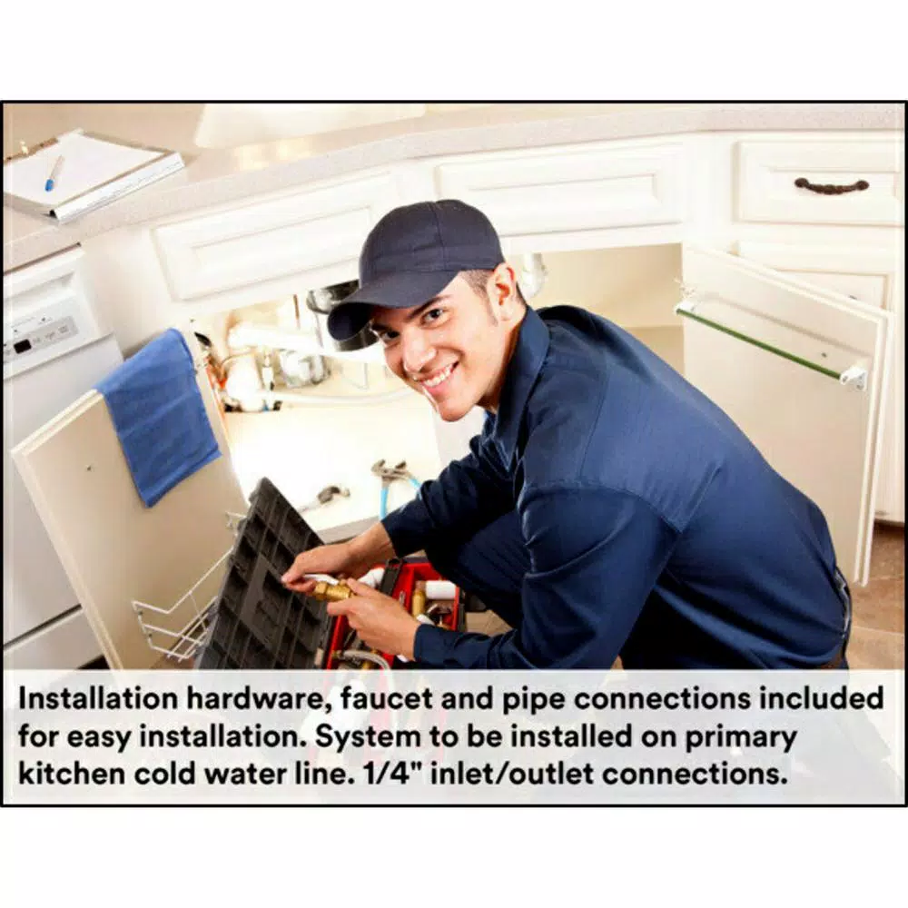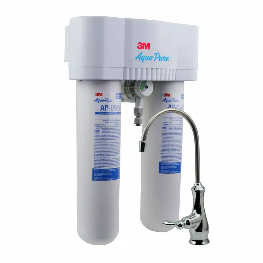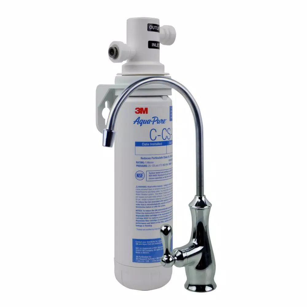 The 3M Aqua-Pure AP-DWS1000 Under Sink Dedicated Faucet Water Filter System that helps reduce particulate, chlorine taste and odor, as well as lead and cysts that may be in your drinking water. This system connects easily under the kitchen sink and includes an attractive dedicated drinking water faucet. Installation hardware, faucet and pipe connections included for easy installation. System to be installed on primary kitchen cold water line. 1/4โณ inlet/outlet connections.