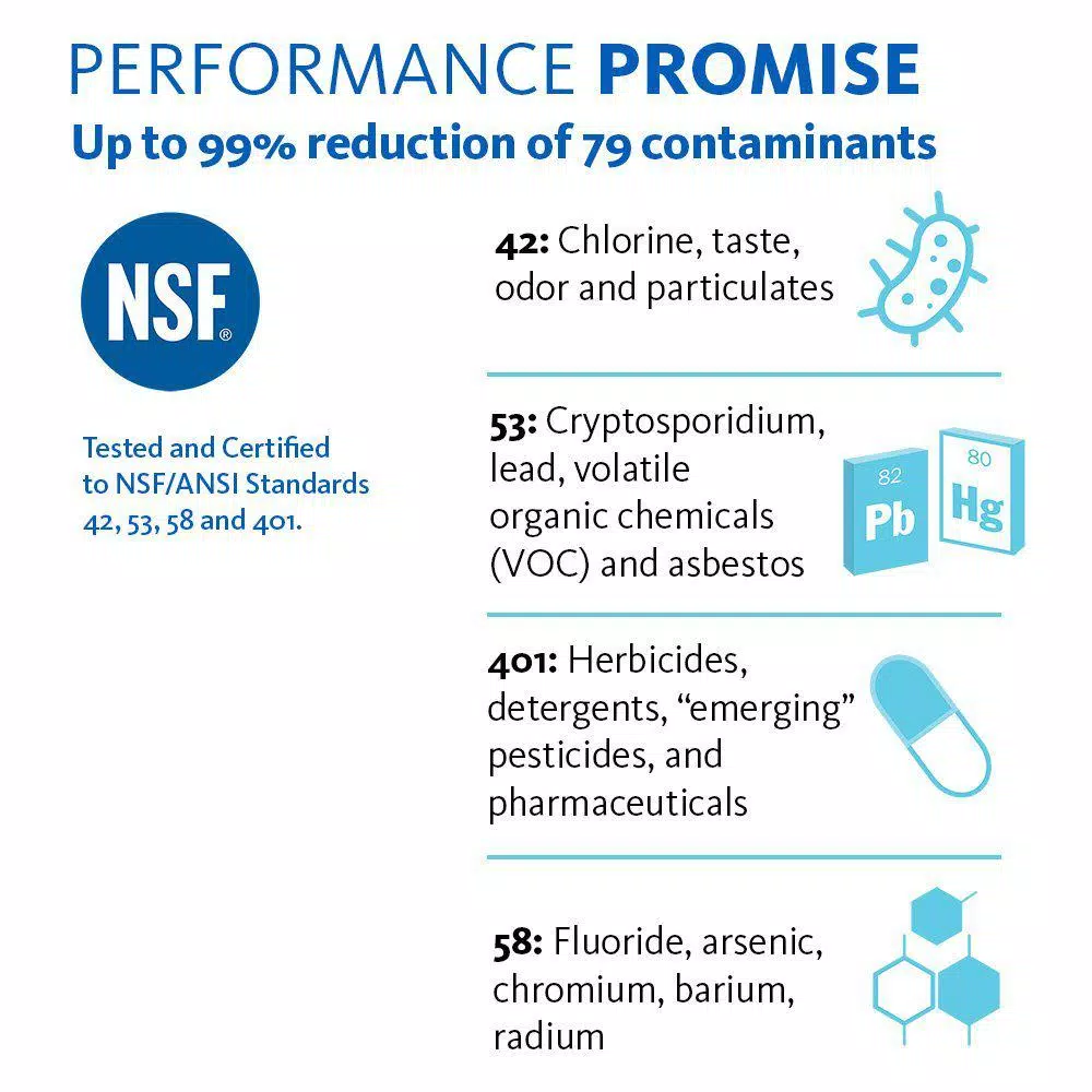 - Guaranteed to reduce up to 99% of 77 contaminants including lead, fluoride, arsenic, chlorine, heavy metals, bacteria, viruses