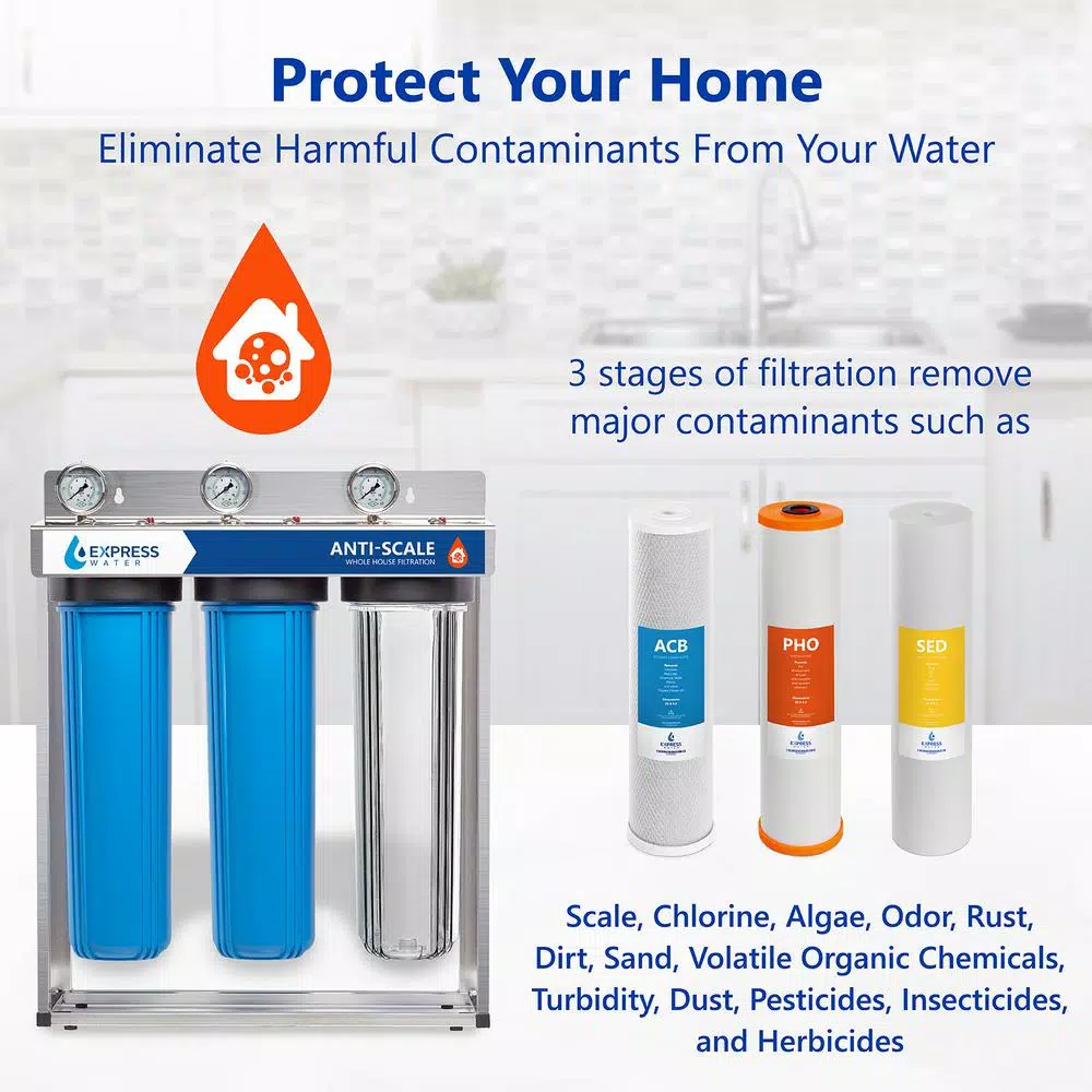 - Whole House Water Filter: Reduce harmful contaminants from your entire home’s water with Express Water’s 3 Stage Water Filtration System. Anti Scale Water Filter: Drink the healthiest water on Earth as your home water filter reduces over 65 different contaminants from your water including chlorine, rust, algae and more while protecting your home from the formation of scale and corrosion