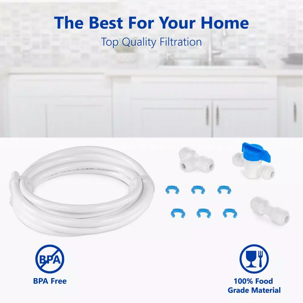 Upgrade your filtration and your home with an easy setup Refrigerator Connection Kit. This kit is compatible with all standard reverse osmosis and undersink filtration systems. The kit uses quick connect fittings and tubing to attach your drinking water filtration to your refrigerator. With a simple, durable, food grade design keeping your water tasting great and safe is simple. The entire kit is made of temperature resistant polypropylene so it doesn’t warp or affect the taste of your water. The BPA free construction ensures that your system is kept completely pure. You may need additional fittings installation if you are installing a non-standard filter or have a refrigerator with different connection needs. The package includes 1 inline ball valve, 1 union tee, 1 union connector, and 15 ft. of white tubing. Get the most out of your filtration. Choose the reliable easy to upgrade your water: The Express Water Refrigerator Connection Kit PRTREFKIT14Q is the best in water purification.