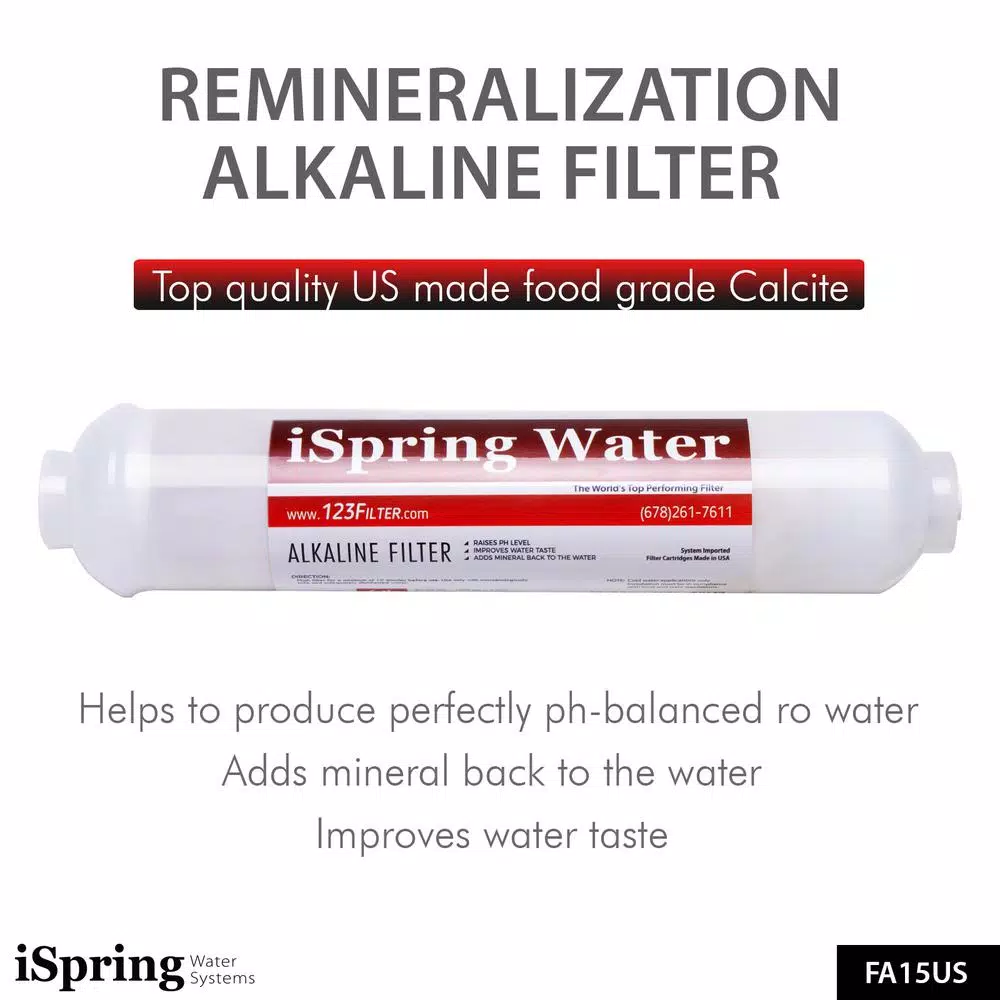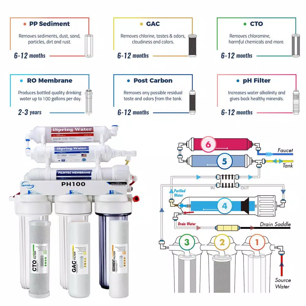 - RO membrane removes not only harmful pollutants but also a few helpful minerals. As a result, a standard 5 stage RO system produces slightly acidic water with a pH of 7. 0 or below. ISpring PH100 includes an additional sixth stage an Alkaline Remineralization filter which restores healthy minerals and produces a balanced alkalinity, which gives the water a more natural taste than regular 5 stage RO water